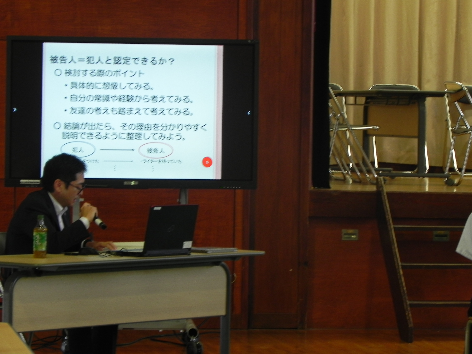 代表の生徒20人に裁判員裁判を模擬体験していただきました。代表生徒の皆さんには、裁判官や裁判員、検察官、弁護人、被告人など、用意されたシナリオの役割を熱演していただきました。
