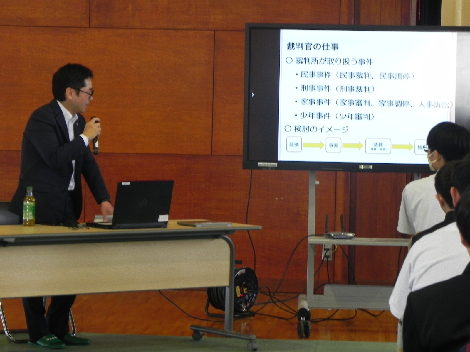 最初に、裁判官から、自身の仕事内容や裁判所について、説明を行いました。