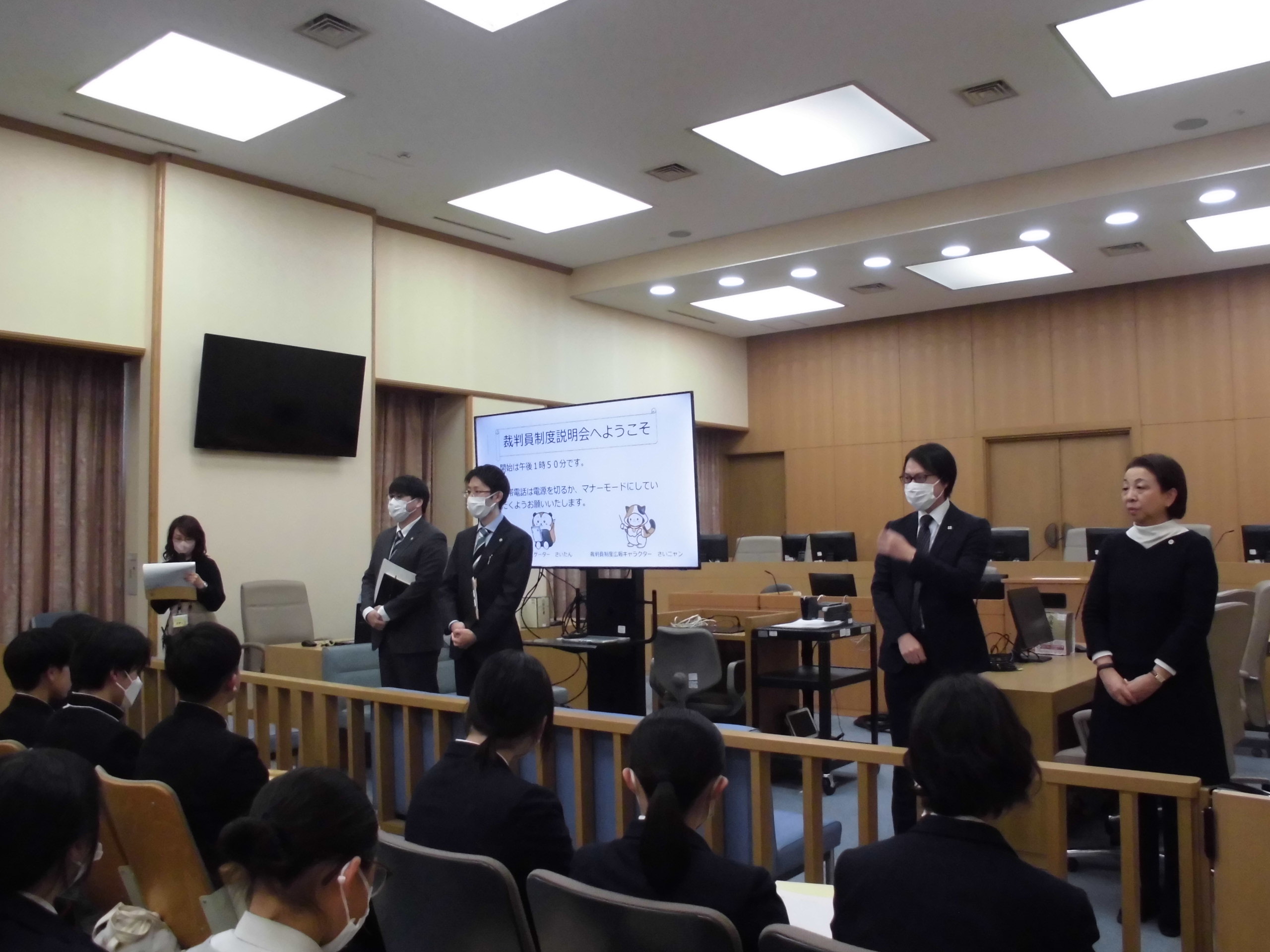 刑事部の裁判官が大型モニターにパワーポイント資料を示し、裁判員候補者から裁判員になるまでの流れ、裁判員に選ばれる確率、裁判員の職務等について、詳しく説明しました。