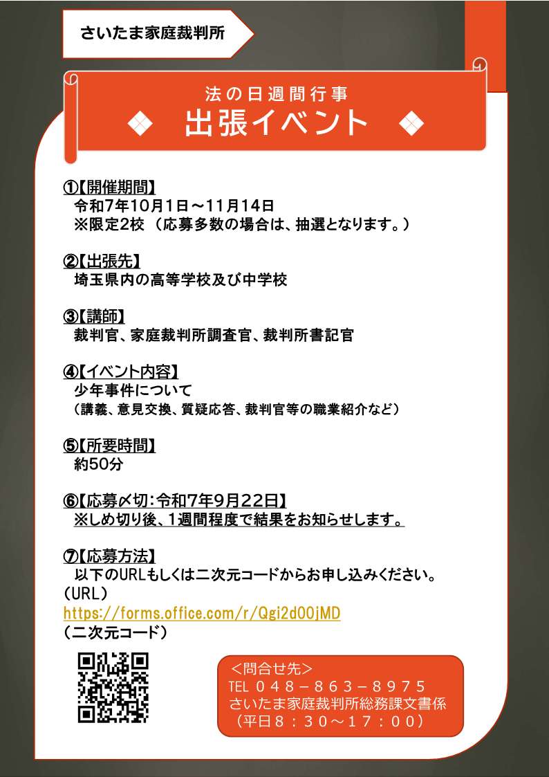 10月1日を「法の日」とすることが定められ、国をあげて、法の尊重、基本的人権の擁護、社会秩序の確立の精神を高めるために行事を行うこととされています。「法の日週間」にちなみ、高校生、中学生のみなさんに裁判所の手続について理解していただくために、裁判官ほか裁判所の職員による出張イベントを企画しました。