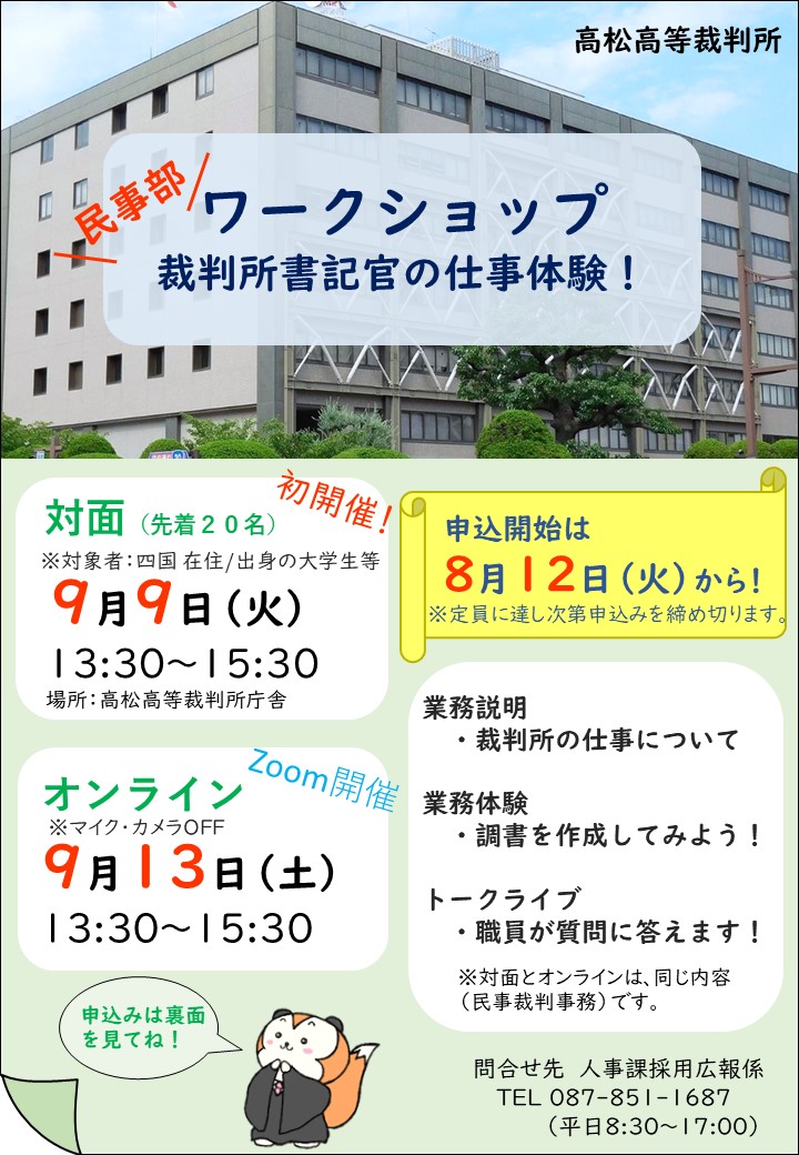 高松高等裁判所では、裁判所事務官、裁判所書記官の仕事に興味を持っている方を対象としたワークショップを開催します。